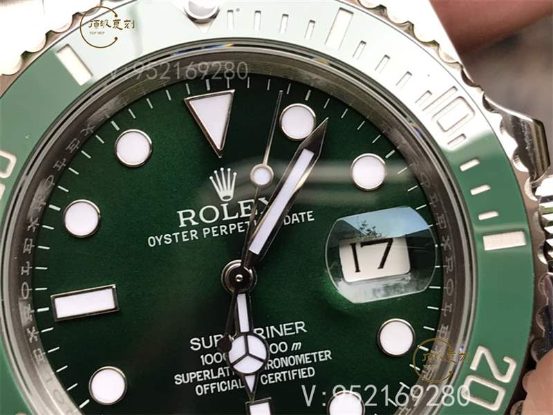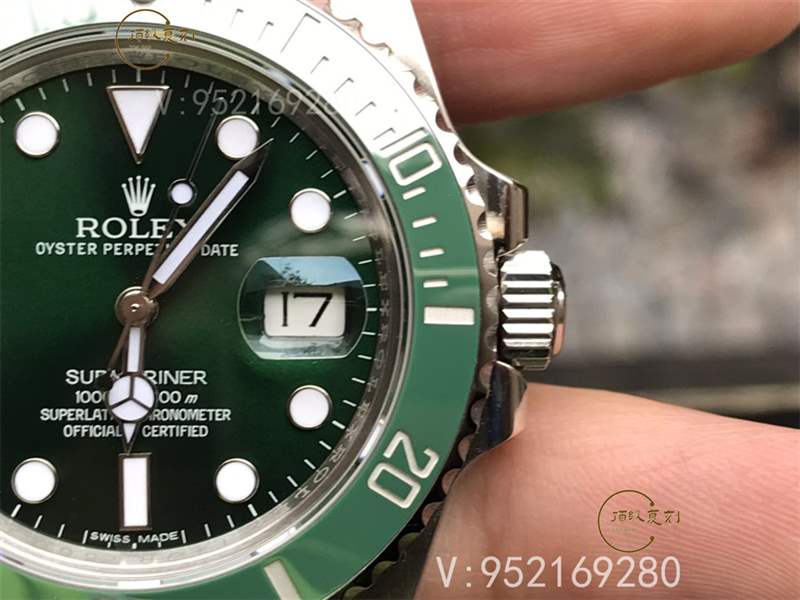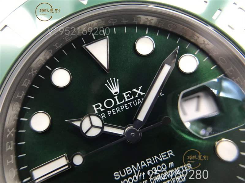 關于與正品的最大區別,或者說兩家綠水鬼的最大區別,也就在于這個色質了,正品的碧綠色,是目前所有工廠都達不到的顏色,這個筆者之前的文章中都有過詳細的介紹,包括與正品綠色的視覺差距,大家可以參考-AR廠V3版本勞力士水鬼深度評測。看日歷,ar廠v3版本水鬼升級了日歷字體印刷工藝,不論粗細還是字體都與正品一致。