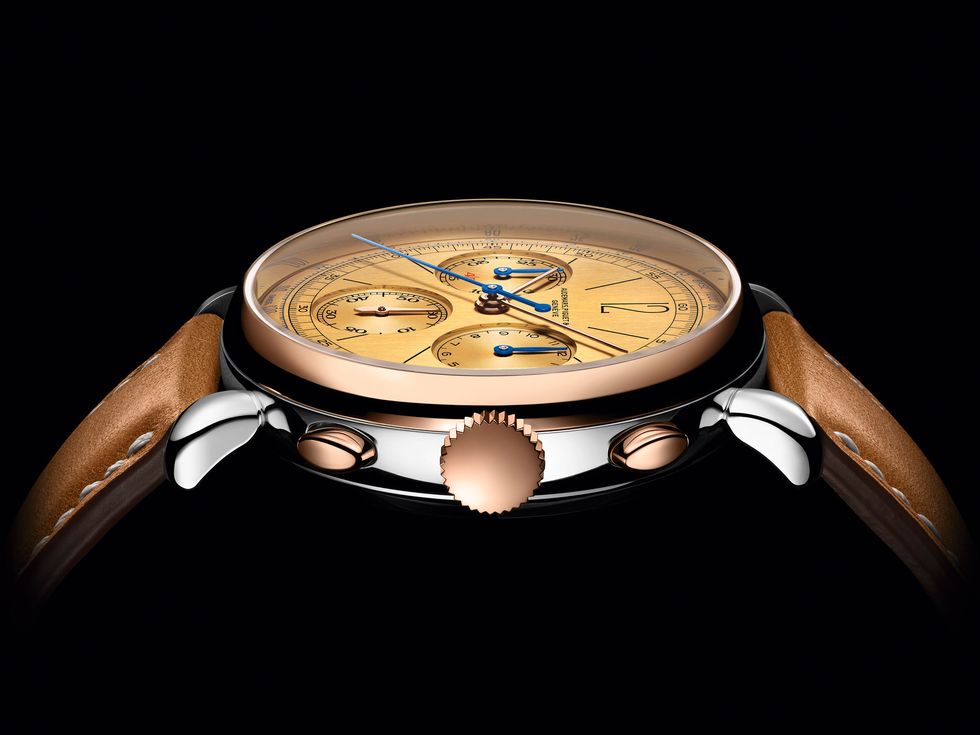 「[Re]master 01」全新自動上鏈飛返計時碼表延續了1943年原創款的重點元素,圓形精鋼表殼搭配淚滴形表耳,表圈、表冠、按鈕與時分秒針皆為18K玫瑰金。
