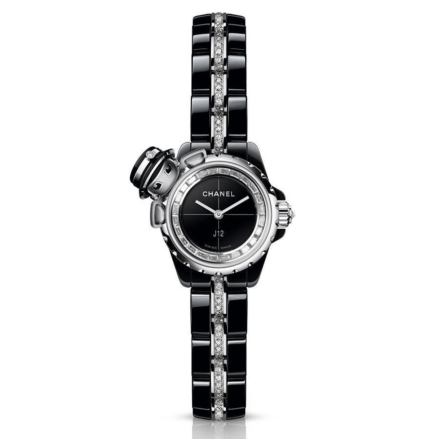表徑19mm/18K白金表殼及黑色陶瓷材質/時、分指示/石英機芯/18K白金香奈兒女士人偶裝飾表殼,表圈、鏈帶、表冠鑲嵌鉆石/防水30米/限量55只/參考售價NT$ 1,452,000