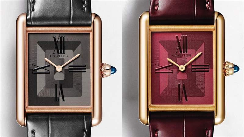 另外兩款Tank Louis Cartier的面盤顏色變化是比較有層次的呈現,1980年代的Must de Cartier除了黑、紅等單色面盤之外,方中有方的多色金幾何圖案也是經典表面??ǖ貋喗衲曛匦陆鈽嬃诉@個設計,以電鍍鐫刻技術印出不同方向的直紋,紅面以漆藝上色、灰面的顏色則是經由電鍍處理,四個定位點處的時標也巧妙形成飄浮感的面盤裝飾,加上亮面轉印的作法讓整個面盤看起來十分有立體感。