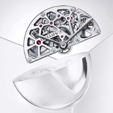 Masse Mystérieuse把輪系結構都整合在半圓型的自動盤里,搭載的是卡地亞全新研發的9801 MC型自動上鏈鏤空機芯,是以鏤空結合神秘鐘概念的自動上鏈機芯,整個自動盤(和機芯)在隨著手腕擺動的同時也會跟著360度轉動,加上自動盤還以鏤空方式露出下方輪系,通透加鏤空的做法自然很有視覺效果。在這邊卡地亞用了多片藍寶石水晶去固定不同的部件,除了鏡面和底蓋之外,時針、分針、自動盤、還有被自動盤繞著轉的固定輪,都用了藍寶石水晶去固定。時分針同樣是透過藍寶石水晶片和表冠連動以調校時間,不過因為輪系設計的關系,表冠在這里單純是設定時間的功用,并不能用來手上鏈,上鏈的工作透過自動盤運作,然后上鏈系統再透過差動輪連動指針去驅動走時。寫到這忍不住又贊嘆了起來,這就是卡地亞復雜功能應該發展的方向啊,因為他是卡地亞,所以才能Masse Mystérieuse。