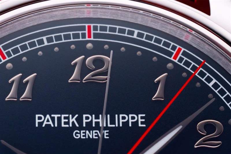 Ref. 5470的另一嶄新之處,便是它的1/10秒計時功能具備兩根計時秒針,當開啟計時功能之后,兩根連動的計時秒針同步出發,銀色計時秒針為標準的60秒走一圈、紅色指針則為每12秒走一圈,前者用來判讀秒數、后者則是能夠判讀更精準的1/10秒刻度,借此大幅提升閱讀性。為此面盤布局上也做了精妙的安排,像是銀色指針對應的銀色圓點,紅色指針則是對應更外側的軌道式刻度,而且你會發現它的軌道式刻度并非連貫性的,而是以每10格刻度為單位、采內外側對調,這能讓視覺效果看起來更清楚。