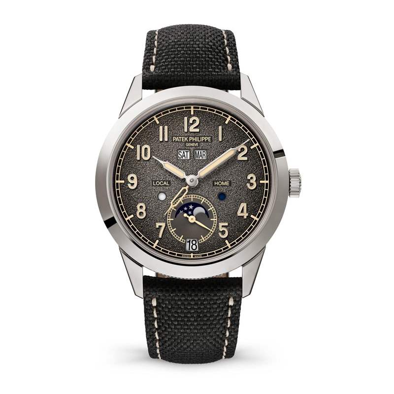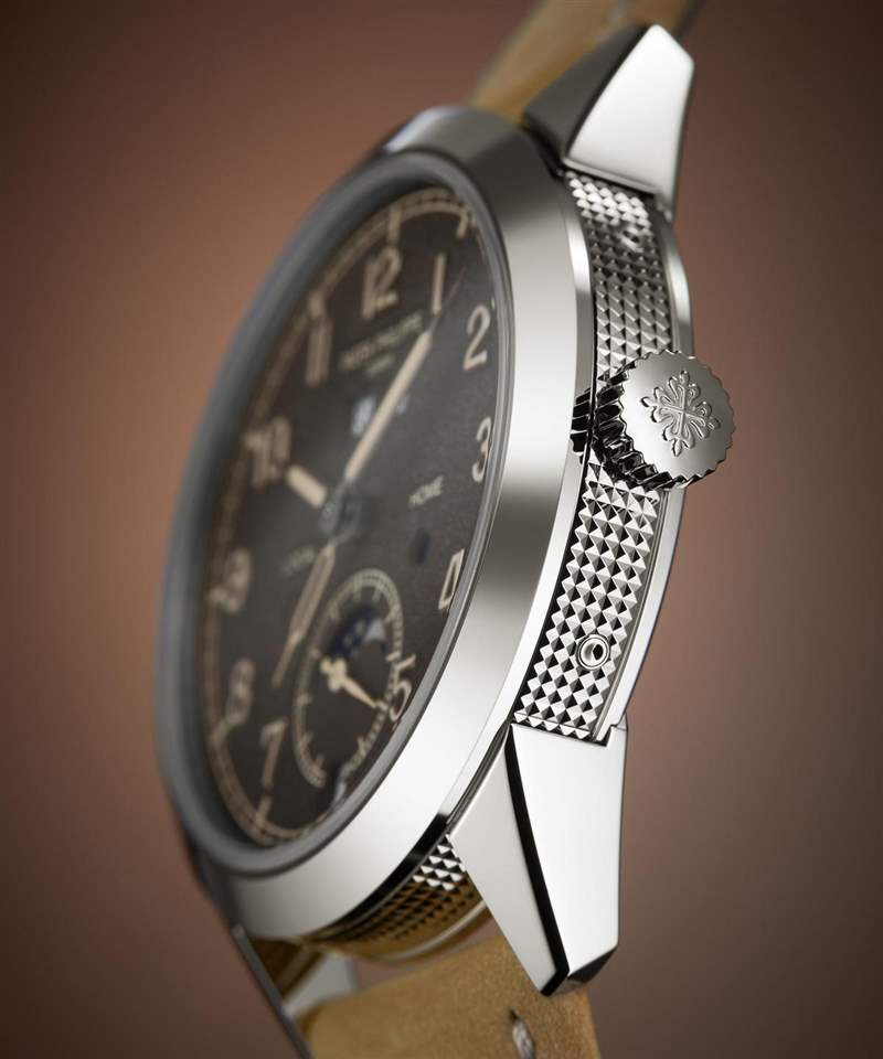 另一個(gè)亮點(diǎn)是它的兩地時(shí)間操作上「簡(jiǎn)化」了。原本百達(dá)翡麗的兩地時(shí)間功能,是像Ref. 5524或Ref. 5164那樣透過(guò)表殼左側(cè)的兩個(gè)按鈕去前后快調(diào),但這次的Ref. 5326是把調(diào)整按鈕整合至單一表冠當(dāng)中,這個(gè)做法其實(shí)去年就已經(jīng)率先使用在Ref. 5269上,三段式的表冠設(shè)定,拉到中間位置便可以順時(shí)針或逆時(shí)針去進(jìn)行兩地時(shí)間調(diào)整,更加便利。
