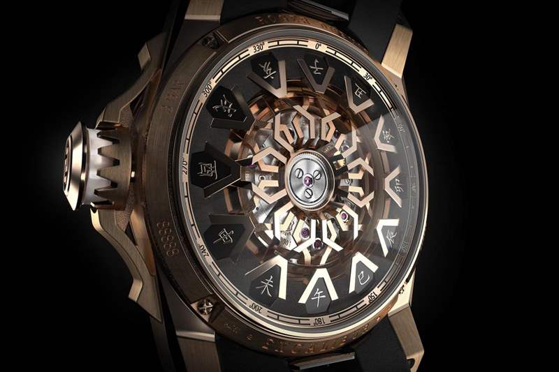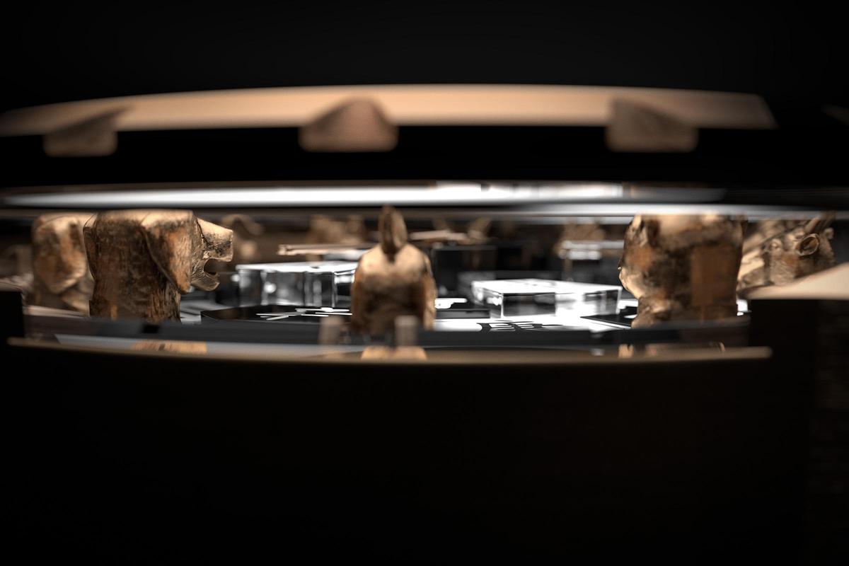 除了面盤更加豐富,這次羅杰杜彼還在表殼結構上做了大幅改動,在表圈下方與表殼的交接處,設置了特別的透明環形窗,透過這層透明結構,收藏家得以更全面地欣賞十二獸首、高低差階梯式的慕拉諾玻璃。羅杰杜彼圓桌騎士十二生肖腕表,45mm玫瑰金表殼,裝載RD824自動上鏈機芯,全球限量12只。