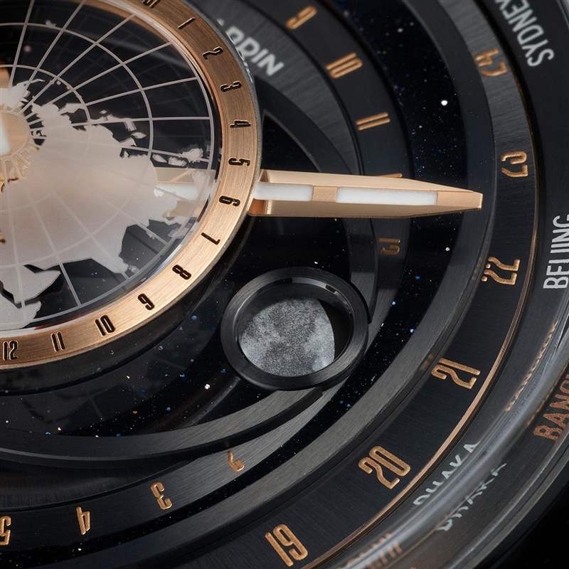 中央固定位置的地球圓盤呈現(xiàn)北半球的地圖,采用相同的拱形藍(lán)寶石水晶設(shè)計(jì);從中心點(diǎn)向外延伸,中央的橢圓形部分為月亮的軌跡,每29天12小時(shí)41分9.3秒會(huì)沿表盤繞行一周,是月相變化的完整周期,再往外則是太陽(yáng),以及世界時(shí)區(qū)城市環(huán)。至于左側(cè)的兩個(gè)表冠,可以直接以小時(shí)為單位,快調(diào)主要時(shí)區(qū)的時(shí)針,快速切換時(shí)間。
