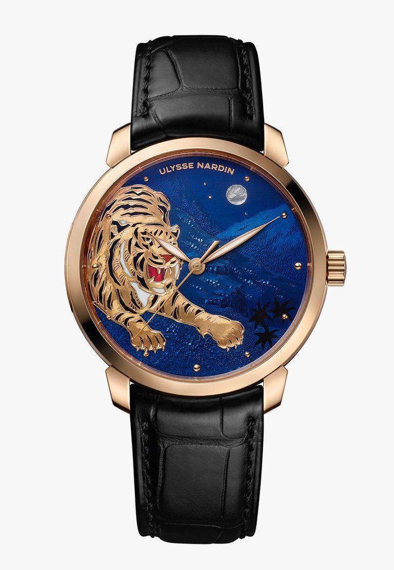 - 江詩丹頓「藝術大師」年度生肖表,是收藏家每年必收的作品。今年的虎年表,有玫瑰金與鉑金二種款式。其面盤融入多種工藝,先手工雕刻花葉裝飾圖案,再以半嵌入式方式將深淺不同的浮雕組出層次,使之有如懸浮于表盤上,覆上大明火琺瑯,再鑲上手工金雕的「老虎」。立體感分明,老虎的神情有種特殊的韻味。各限量12只。