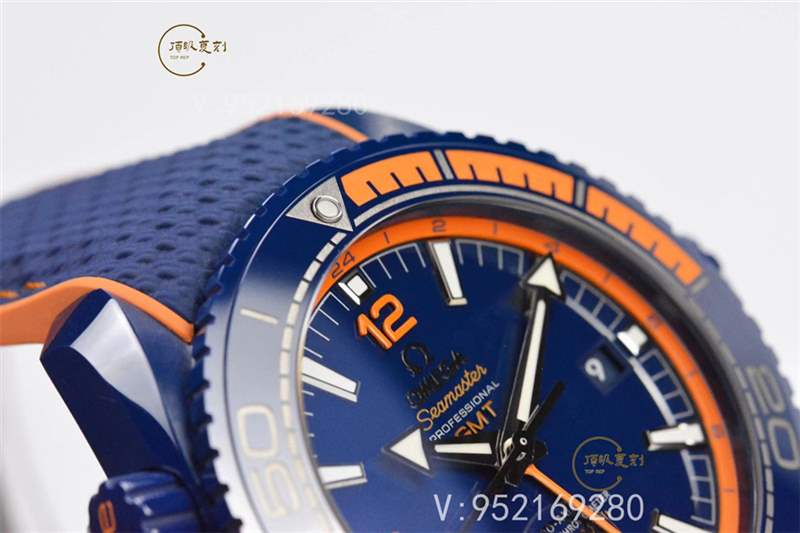VS廠這款45.5毫米的碧海之藍(lán),配備藍(lán)色陶瓷表盤和橙色GMT指針。腕表的指針和小時(shí)刻度由白色18K金打造而成,表面覆以白色Super-LumiNova夜光涂層,令藍(lán)色表盤閃耀迷人光澤。藍(lán)色陶瓷表圈上飾有以O(shè)MEGA Liquidmetal?技術(shù)精制而成的潛水刻度,前15分鐘的刻度以獨(dú)特的橙色橡膠裝飾,于陶瓷材質(zhì)上更顯明亮醒目。