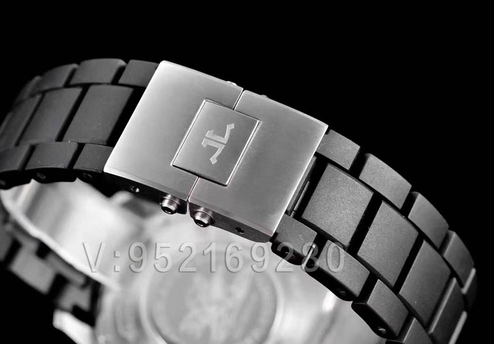 N廠積家壓縮大師表扣部分是一個拉絲處理的蝴蝶扣,同樣也是和殼套一樣采用316鋼材質。N廠另一讓人驚嘆的是它的表帶設計,其表帶的本體是精鋼表帶,但是在精鋼外覆蓋了一層橡膠涂層,兼具了精鋼表帶的堅實耐用和橡膠表帶舒適的特點。