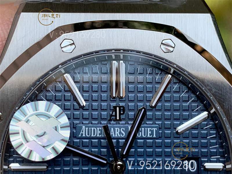再細看盤面,表盤“Audemars Piguet”與表盤是呈現凸起狀,而非持平狀態。這里我們說的并不是印刷字體下面的模塊,而是字體,這個用手機比較難拍,不過我們可以通過其字體的厚重程度來觀察,略從側面看,我們會發現字體渾厚有力。