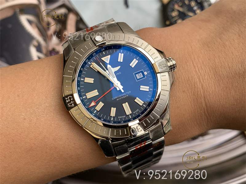 GF廠新品百年靈-復仇者雙時區自動機械腕表45(Avenger Automatic GMT 45)。原裝開模精鋼表殼(直徑45mm,厚度12.31mm),搭載Asia-2836機芯。可選擇精鋼表鏈或相匹配的黑色或藍色軍用防水皮革表帶。技術突破: 外圈夜光點所鑲嵌藍寶石玻璃與原裝一致帶“魚眼”效果(側看),制作難度極高,這也是作為鑒定是否GF出品的重要依據!G Factory,專注良心好品質。