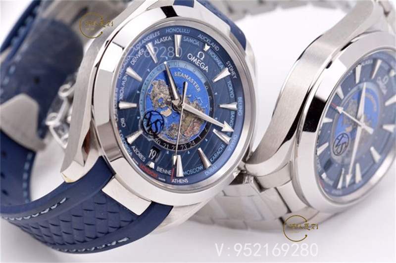 表盤和表鏡藍(lán)色太陽紋飾表盤和藍(lán)寶石鏡面:藍(lán)色太陽紋飾表盤,表盤中央的鈦金屬板上刻畫了從北極俯瞰地球的影像,地圖外圈是24小時(shí) 藍(lán)色海洋以激光燒蝕技術(shù)制成,陸地輪廓則以浮雕制成,海洋與陸地顏色鮮明對比。外側(cè)設(shè)有24小時(shí)hesalite水晶環(huán),淺藍(lán)色指示白天,深藍(lán)色指示夜晚。在24小時(shí)刻度環(huán)之外,是Aqua Terra系列標(biāo)志性的垂直柚木紋理表盤,表盤的最外圍環(huán)繞著世界各地的不同城市,白色字體城市為應(yīng)用夏令時(shí)的地點(diǎn),藍(lán)色字體城市為常規(guī)地點(diǎn),包括歐米茄總部瑞士Bienne所在的GMT+1時(shí)區(qū),而東八區(qū)的城市名稱則是Beijing(在兩點(diǎn)鐘刻度上方)。