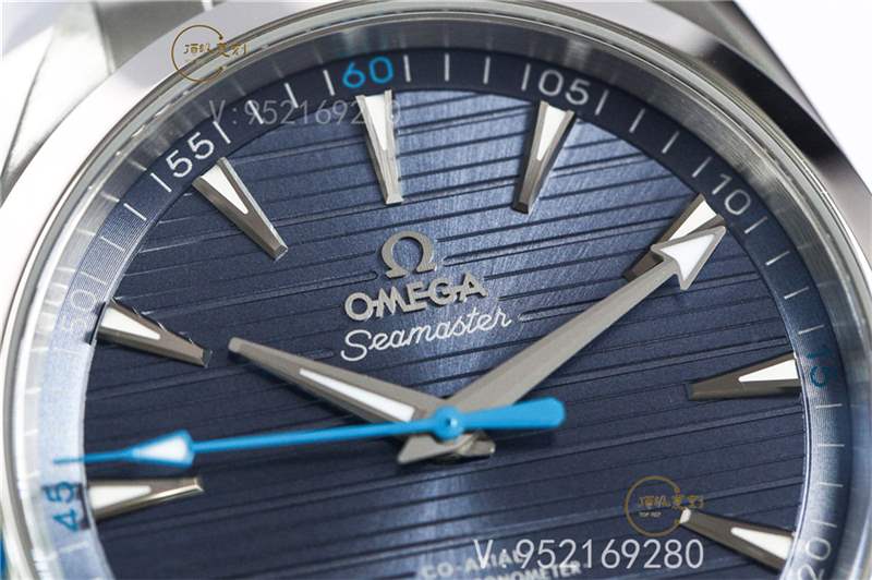 盤面,采用了雙面藍(lán)寶設(shè)計(jì),保證了腕表通透性的同時(shí),也具有一定的耐刮特性。柚木紋理清晰,粗細(xì)紋路保持高度一致且紋路底部都有加工,看上去整齊劃一。歐米茄金屬標(biāo)志平面拉絲,平整細(xì)膩,可見下圖。這里很多小廠是拋光的。字面上的刻度紋理也是非常具有立體感,簡(jiǎn)單的大三針設(shè)計(jì),小時(shí)刻度、時(shí)針、分針及計(jì)時(shí)秒針覆有白色Super-LumiNova夜光層,這里VS的夜光同樣是進(jìn)口夜光涂料,黑暗情況下夜光顯示明亮,同時(shí)字面條釘拉絲干凈整潔,質(zhì)感優(yōu)良。
