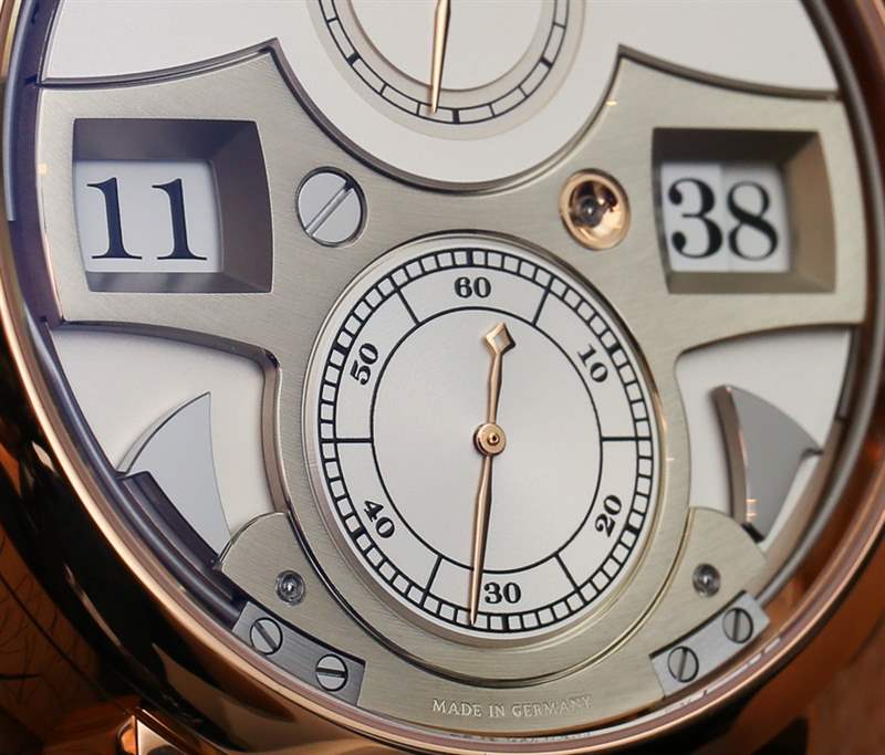 最初的 Zeitwerk 展示了一個雙數(shù)字顯示屏,提供了一個窗口,可以查看左側(cè)的小時數(shù)和右側(cè)的分鐘數(shù)。圓盤具有跳躍數(shù)字,這意味著當(dāng)小時或分鐘發(fā)生變化時,下一個數(shù)字會立即跳到位,而不是逐漸移動的圓盤。顯示屏下方是傳統(tǒng)的模擬小秒盤,上方是動力儲存指示器。后一種功能是我認(rèn)為在手動上弦手表中極為重要的功能。廣告留言廣告信息結(jié)束