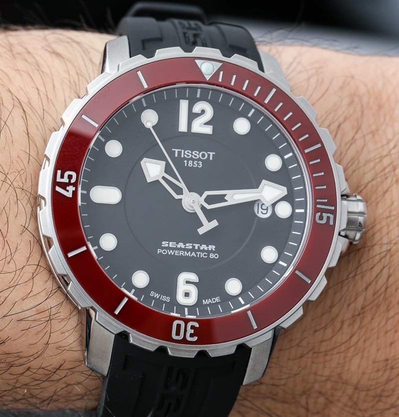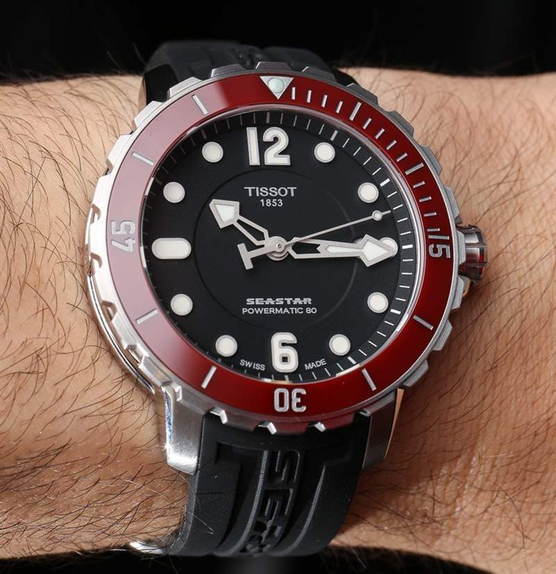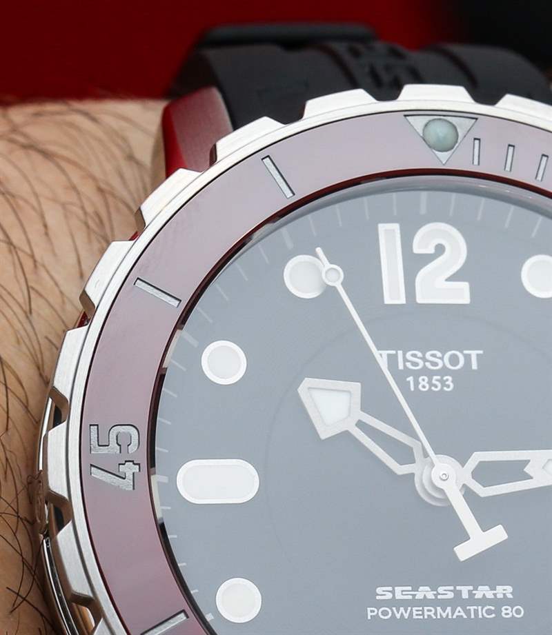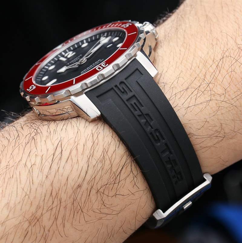 如果將 2013 年和 2014 年的 Seastar 1000 手表并排放置,需要一分鐘才能看出兩者之間的差異。不過有很多。讓我們從擋板開始。2014 年,天梭為 Seastar 配備了陶瓷表圈嵌件,有藍色、黑色和栗紅色可供選擇。當(dāng)然,后者賦予腕表黑色和紅色調(diào),類似于非常時尚的帝舵Heritage Black Bay。實際上,陶瓷表圈插件相當(dāng)不錯。它們不僅僅是一個扁平的環(huán),而是在表圈與表盤相接的地方稍微傾斜一點,標(biāo)記實際上是切入表圈而不是印在表圈上。