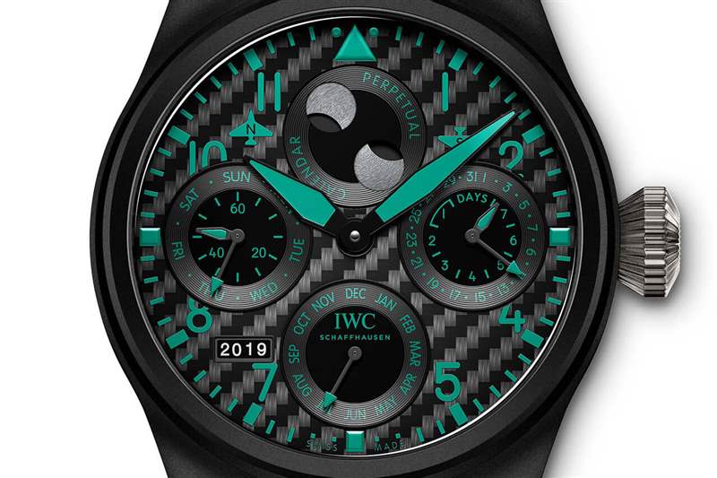 就 Big Pilot Perpetual Calendar 而言,這意味著每個數(shù)字、索引和指示器都被選為綠色。在編織碳纖維背景和純黑色小表盤的襯托下,它營造出非常酷的隱形外觀,尤其是在黑色小牛皮表帶上飾有對比色翡翠色縫線時。