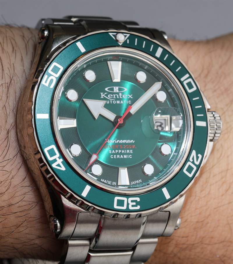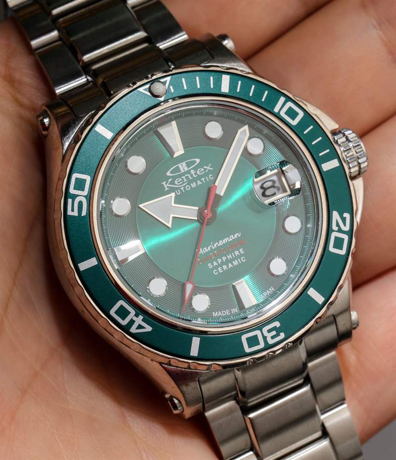 新款 Kentex Marineman 寬 45 毫米,采用不銹鋼或 IP(離子鍍層)黑鋼表殼。實際上兩者看起來都不錯。在日本手表中很難找到 PVD ??涂層工藝,但他們的 IP 處理通常非常好。雖然我更喜歡日常佩戴的拉絲/拋光鋼表殼,但黑色的 Marineman 表殼看起來很酷。我不確定是否所有表盤/表圈顏色版本都提供黑色。同樣重要的是要注意,并不是所有的顏色版本都在這篇文章中被描繪出來。據(jù)我所知,新款 Marineman 腕表提供黑色、黑紅、綠色、藍(lán)色和白色珍珠貝母表盤版本。