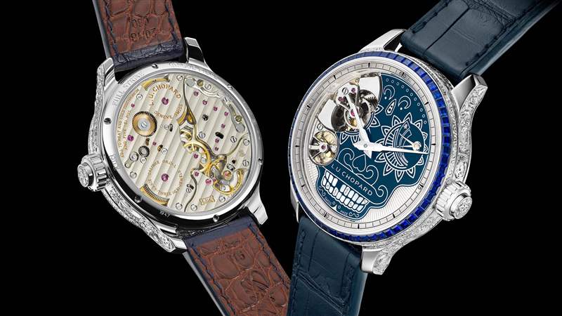 手表的制作和組裝分幾個(gè)步驟進(jìn)行。表殼由 18k 白金(通過蕭邦的道德黃金供應(yīng)鏈采購(gòu))制成,并在表殼帶上精心雕刻了以亡靈節(jié)為靈感的圖案,包括卡拉維拉斯、風(fēng)格化的吉他和花卉設(shè)計(jì)。雕刻非常復(fù)雜,延伸到表耳,當(dāng)然還有表冠,表冠也飾有卡拉維拉。