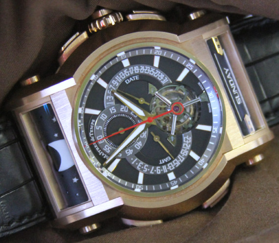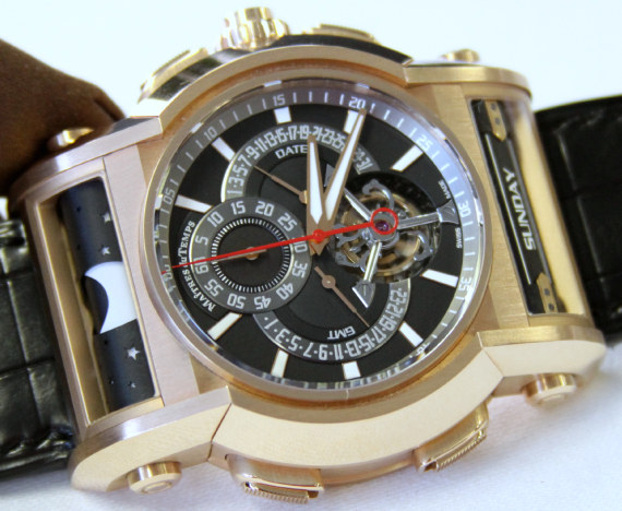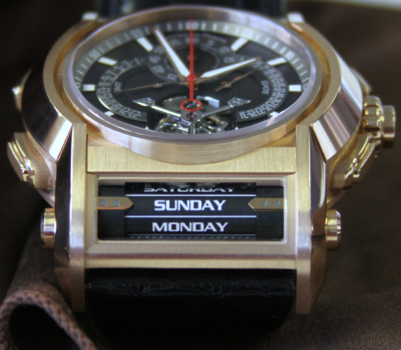 第一章圓形腕表的表盤實(shí)際上已經(jīng)“四舍五入”。它現(xiàn)在具有更主流的外觀,并且更容易閱讀。指針上的Lume使它們與表盤形成更好的對比,并與小時(shí)標(biāo)記相匹配。這些取代了原版上的羅馬數(shù)字小時(shí)標(biāo)記。雖然外觀不那么宏偉,但第一章圓形的表盤更容易閱讀。其中包括時(shí)間以及其他功能,如日期、格林尼治標(biāo)準(zhǔn)時(shí)間指針和單按鈕計(jì)時(shí)碼表。不要忘記表盤上的外露陀飛輪。如果表盤感覺有點(diǎn)缺乏情感,那么表殼肯定不會(huì)。你可以看到設(shè)計(jì)師Christophe Claret和Peter Speake-Marin在這里大放異彩。對我來說,這個(gè)設(shè)計(jì)看起來像是他們兩個(gè)個(gè)性的真正融合。我認(rèn)為用于月相和星期幾的鋁制圓柱滾輪集成得非常好??鋸埖慕嵌群蛨?jiān)固的外觀特征遍布整個(gè)表殼,使其外觀自豪。它也是彎曲的,適合你的手腕。
