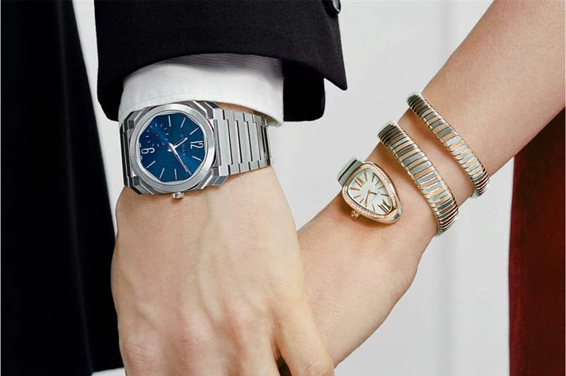 這雙「情侶表」其實來自品牌不同系列,實情「大纜都扯唔埋」,但兩者結合又出奇地非常適合成為「情侶表」。男裝的是OCTO Finissimo,八角形表殼加上全精鋼的設計,完全散發出男性的剛強魅力;而BVLGARI的當家大作Serpenti的蛇形設計,又可帶出女性纖細手腕的柔美。兩者就是因為風格截然不同,反而令落差感成為焦點,就像圖中戴著OCTO Finissimo的男士緊握著戴著Serpenti的女士,呈現出一種男士保護女士的浪漫,比起一式一樣的傳統情侶表,這組合更有意思與感動。