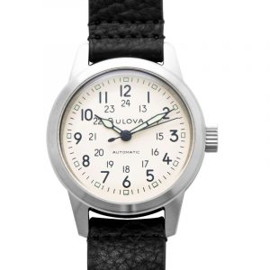 此表屬Bulova的Hack系列,是以二戰美國軍表為原型的復刻類手表。此表以黑色皮革表帶襯上原色精鋼圓形表殼,表面以象牙色表盤置上軍表特有的1至12及13至24雙數字圈黑色刻度,清晰而俐落,卻又不落俗套,能輕易在面試時流露你靈活多變的一面。