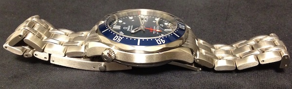 41 毫米精鋼表殼包括一個單向潛水表圈,雖然不是最容易抓握的,但易于使用且感覺良好,60 個標記中的每一個都可以令人滿意地轉動。這種類型的單向表圈允許潛水員設置他或她的開始時間(轉動表圈以與分針對齊),從而通過讀取分針在表圈上的位置輕松讀出總潛水時間。該表殼防水深度達 300 米,并包括一個手動排氦氣閥。歐米茄可以提供自動閥門,但他們喜歡 10 點鐘位置額外表冠的外觀。