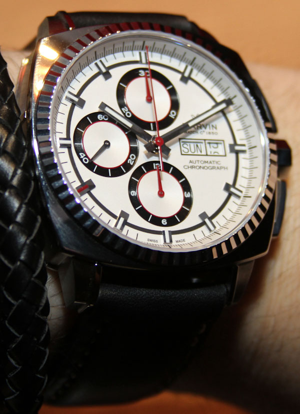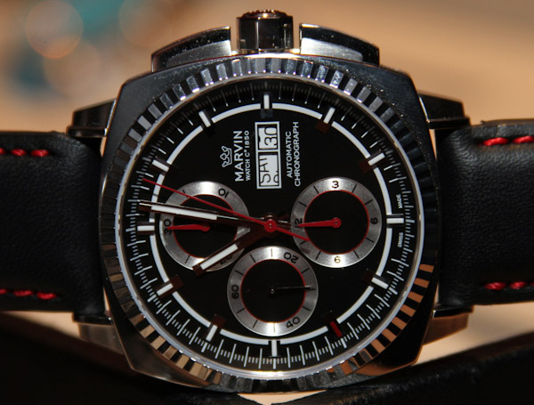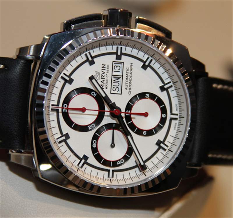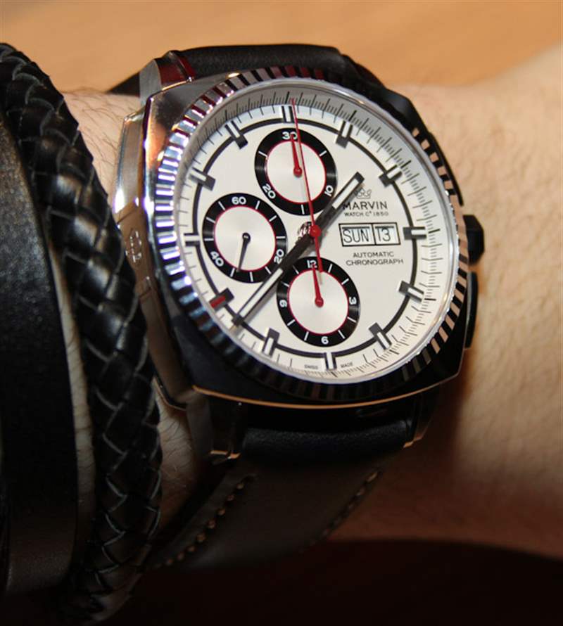 表殼寬 42 毫米,采用精鋼制成,防水深度達(dá) 50 米。計時按鈕的集成是現(xiàn)代的。像這樣的東西使舊的柱塞式推動器看起來……。好老。目前,Marvin Malton Cushion 計時碼表將提供奶油色配黑色或黑色配銀色表盤。