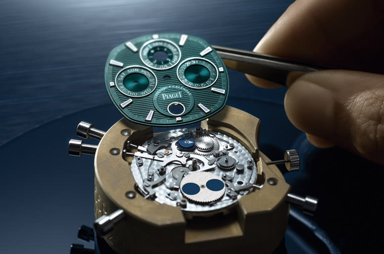 ▲伯爵改良1200P超薄機(jī)芯,使其進(jìn)階為萬年歷復(fù)雜功能,并搭配上近年風(fēng)行的綠色面盤,呈現(xiàn)賞心悅目的視覺感受。