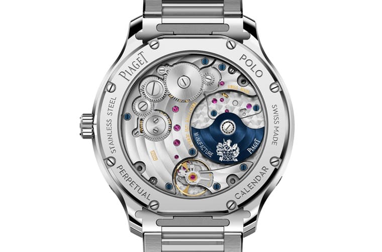 翻至表背可見Polo超薄萬年歷搭載的1255P自動機(jī)芯,其以1200P機(jī)芯為基礎(chǔ),加上萬年歷模組使得手表功能大幅躍進(jìn),重點(diǎn)是即使功能復(fù)雜度提升,但機(jī)芯的厚度還是維持在4mm水準(zhǔn),也因此Polo超薄萬年歷的表殼厚度比起同功能作品相對輕薄許多(8.65mm),佩戴上手的舒適度會令人頗感驚艷。