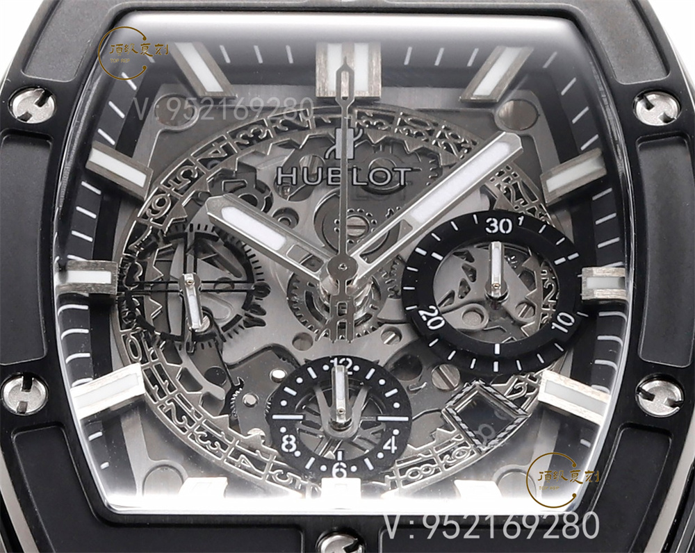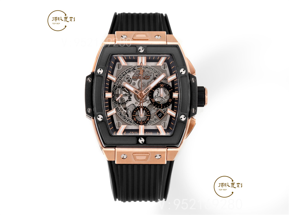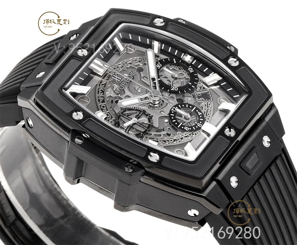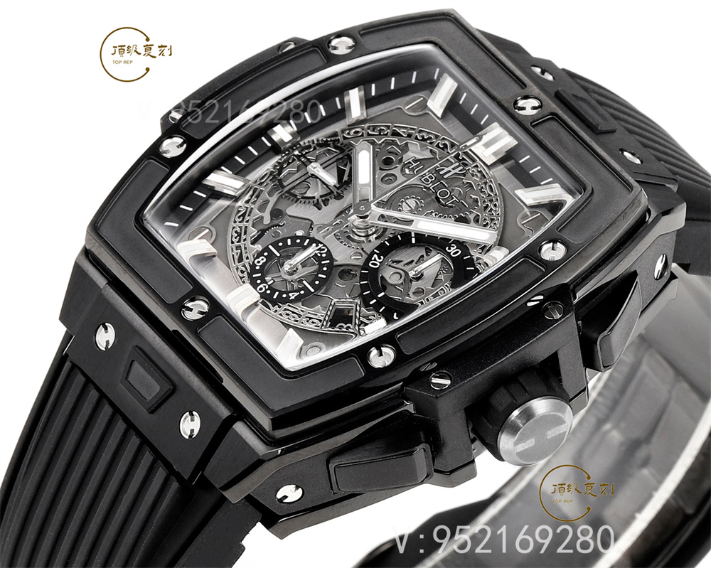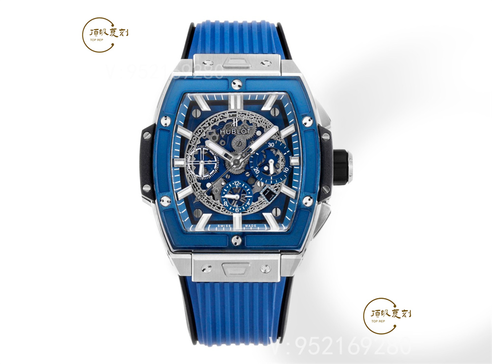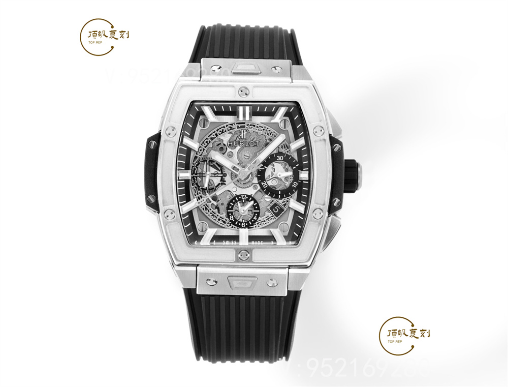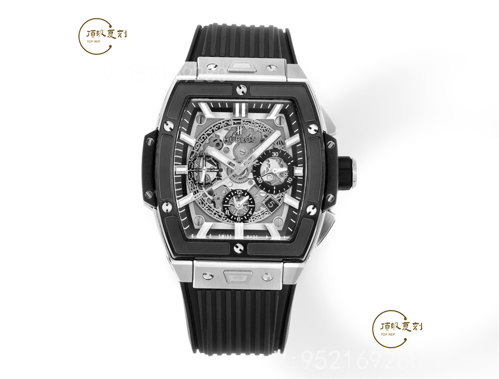 整表采用宇舶最具代表的H形螺絲(如果大家要玩拆解的話某寶很多專拆宇舶的螺工具),表殼主體為鈦金屬材質(zhì),透明藍(lán)寶石盤面顯露出裸露的機(jī)芯,整體混為一體,強(qiáng)烈的金屬質(zhì)感,外加立體多層次的元素組合,大家可以參考鐵血戰(zhàn)士這個(gè)電影,這個(gè)表采用的元素很多是來自于哪個(gè)靈感!硬暴力美學(xué)設(shè)計(jì),凸起的肌肉線條!搭配藍(lán)寶石水晶玻璃表鏡,表冠采用鈦金屬與橡膠材質(zhì)制成,表全透設(shè)計(jì)!正品機(jī)芯采用HUB 4700機(jī)芯,動(dòng)力儲(chǔ)備為50個(gè)小時(shí),復(fù)刻版本采用7750機(jī)芯代替,滿動(dòng)力也是四十多小時(shí)(配合手動(dòng)上鏈)。