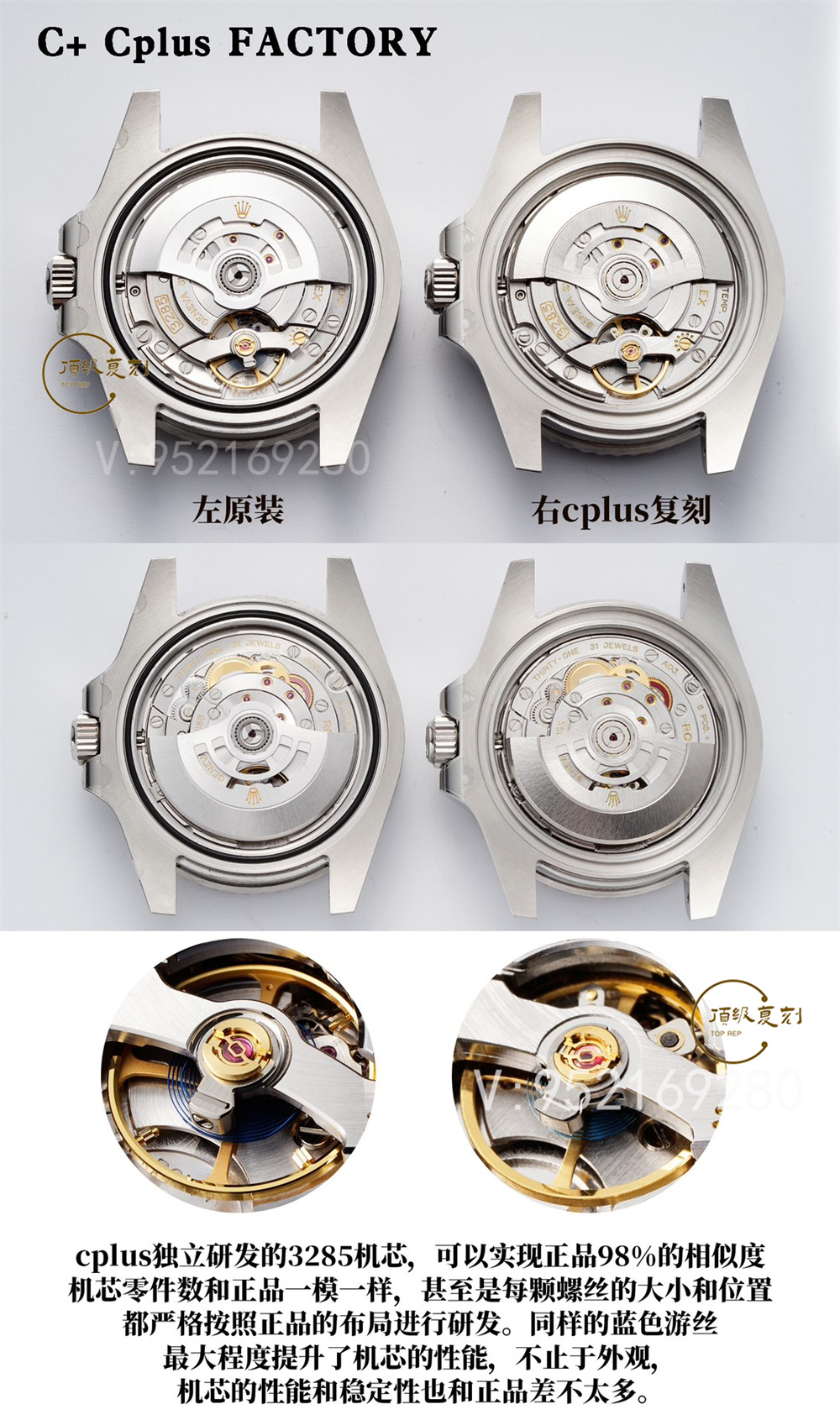 cplus獨立研發的3285機芯,可以實現正品98%的相似度,機芯零件數和正品一模一樣,甚至是每顆螺絲的大小的位置,都嚴格按照正品的布局進行研發。同樣的藍色游絲最大程度提升了機芯的性能,不至于外觀,機芯的性能和穩定性也和正品差不太多。