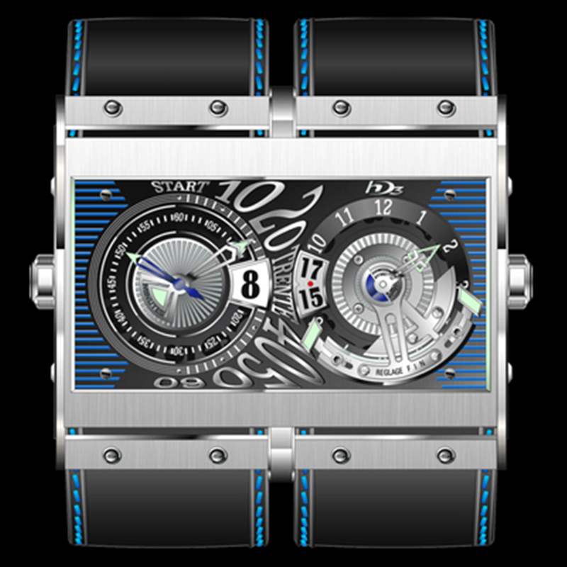 風格方面,表盤很有趣。當然很奇怪。表盤由半透明片組成,可能是藍寶石,上面應用了裝飾元素。這為您提供了底層機制的某種視圖。在中間,在兩個表盤之間,是阿拉伯數字,看起來煙熏在一起 – 用于逆跳分針。為了有趣,HD3包括30的“trente”和0的“start”。