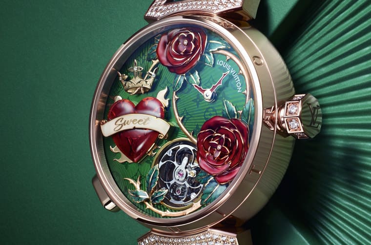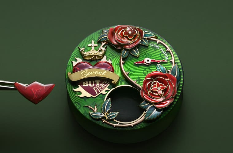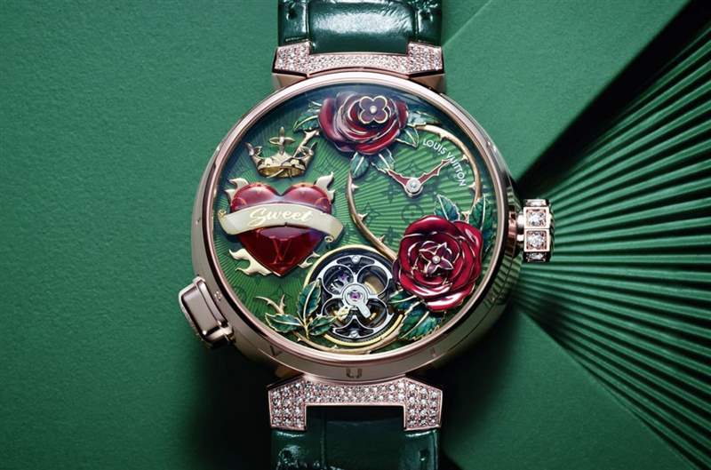Tambour Fiery Heart的面盤乍看有6點(diǎn)方向的陀飛輪、4點(diǎn)方向與12點(diǎn)方向的玫瑰圖案,以及9點(diǎn)方向的愛心加皇冠圖案,另外在面盤右上方細(xì)看還有金雕玫瑰藤蔓圍成的時(shí)、分小表盤,其中指針造型猶如玫瑰花莖的延伸,帶有不規(guī)則造型,視覺感受既奇特又符合手表整體的調(diào)性,加上其表面涂上鮮艷的紅色,在綠色琺瑯背景映襯下看得非常清楚,且注意看面盤的琺瑯底下還點(diǎn)綴著路易威登特色的Monogram花紋,同時(shí)面盤也帶有放射紋裝飾,凡此都讓手表散發(fā)出精致迷人的個(gè)性。