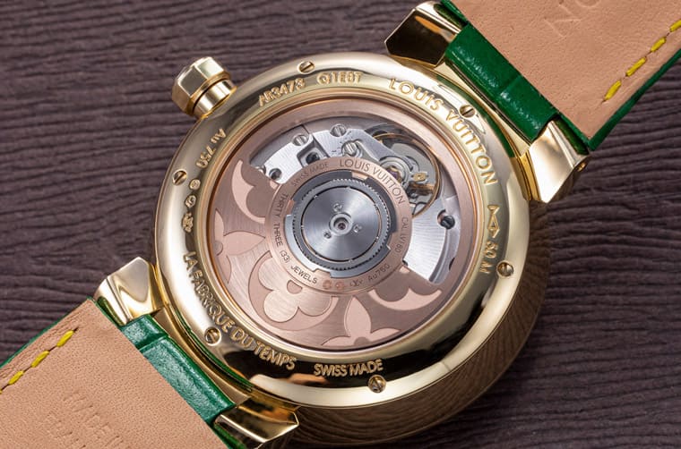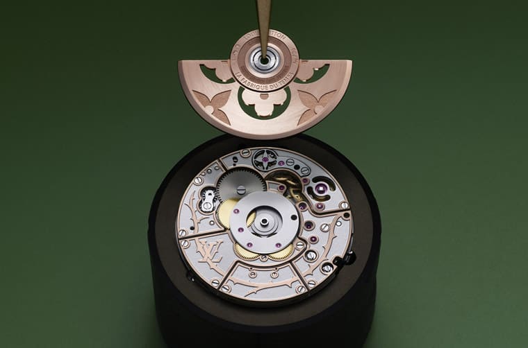 ▲機(jī)芯自動盤刻有Monogram花紋、機(jī)芯底板則有玫瑰藤蔓圖案與LV標(biāo)志,展現(xiàn)品牌強(qiáng)大的工藝基因。