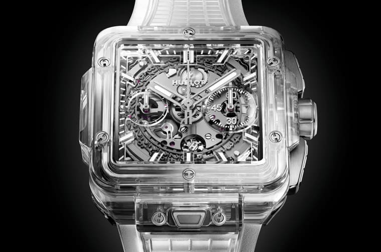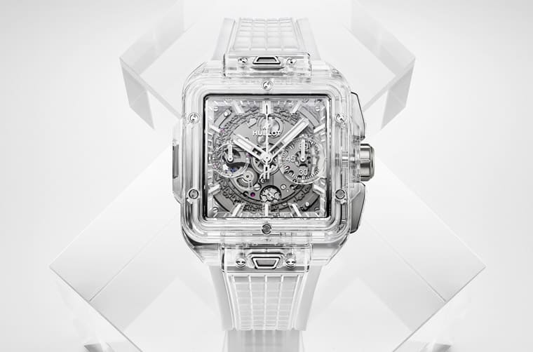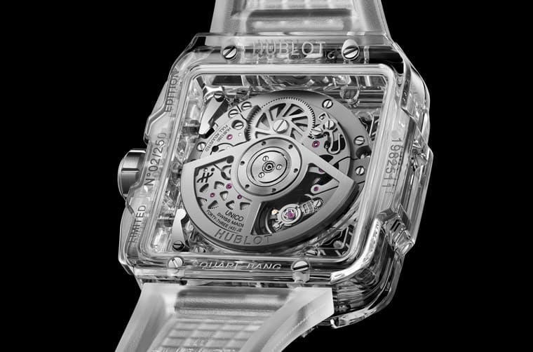 ▲首度啟用藍寶石水晶材質制作Square Bang Unico計時碼表的表殼,無色透明的特性讓手表內部更能一覽無遺。
