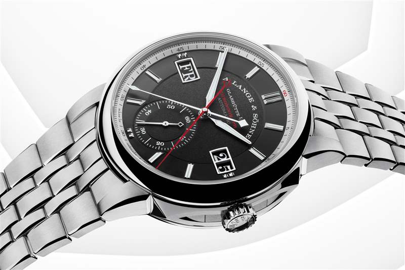 這里的表殼由三部分組成,直徑為 42.5 毫米(非計時款為 40.5 毫米),由不銹鋼制成。表面是啞光的,邊緣是用黃金時間倒角強調的。這款手表的額定壓力為 12 巴(或 120 米!),這對任何朗格或任何高端計時碼表來說都不是玩笑。表盤為黑色且質地細膩,按鈕貼花為白金,秒顯示的分數位于分鐘計數器外的內環上。表殼現在的厚度為 14.2 毫米,高于傳統參考值的 11.1 毫米。秒針、60 分鐘刻度和“Odysseus Chronograph”字樣均為紅色。您擁有與這個家庭的所有成員相同的可調式手鏈,并且做工精細得令人發指,我怎么強調它們在金屬中與在諸如此類的新聞照片中的影響力都不為過。事實上,收藏家之間的共識是,在過去的十年中,沒有一款手表在現實中比在新聞材料中表現得更好。