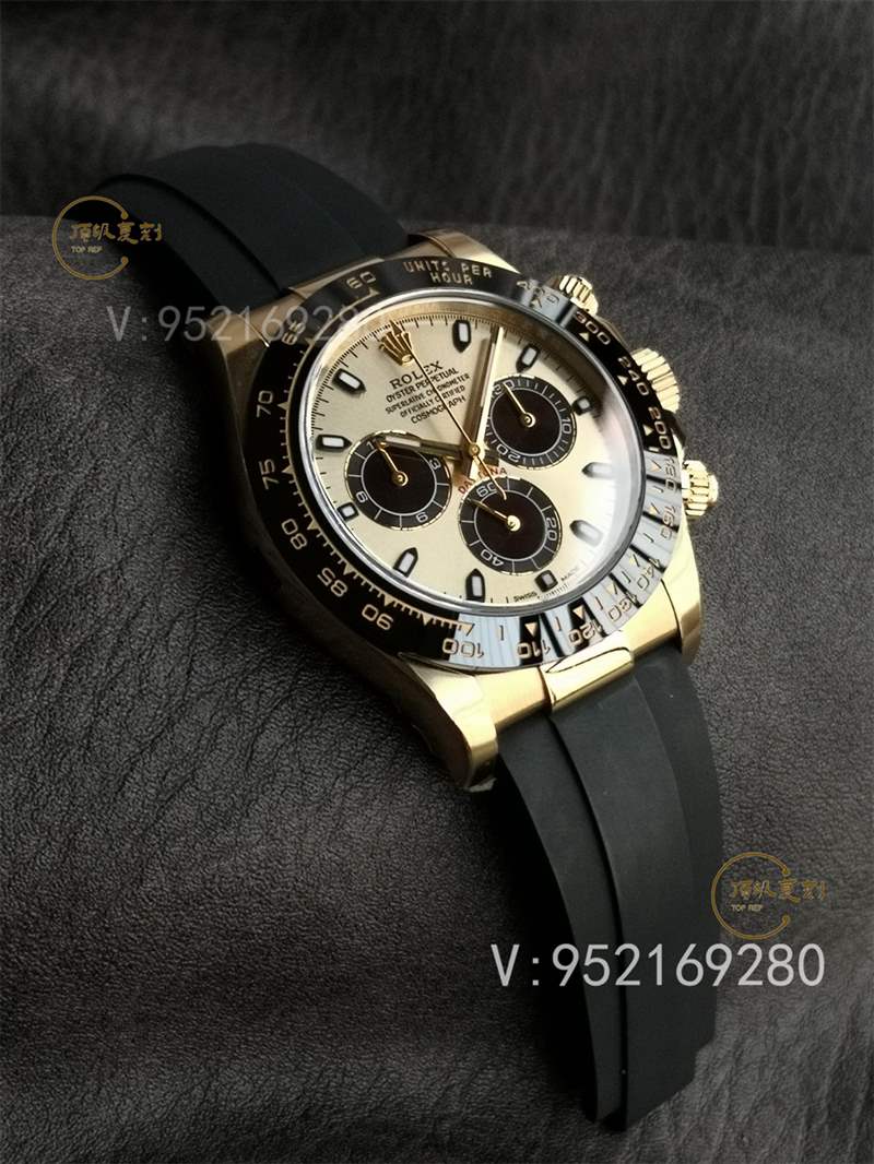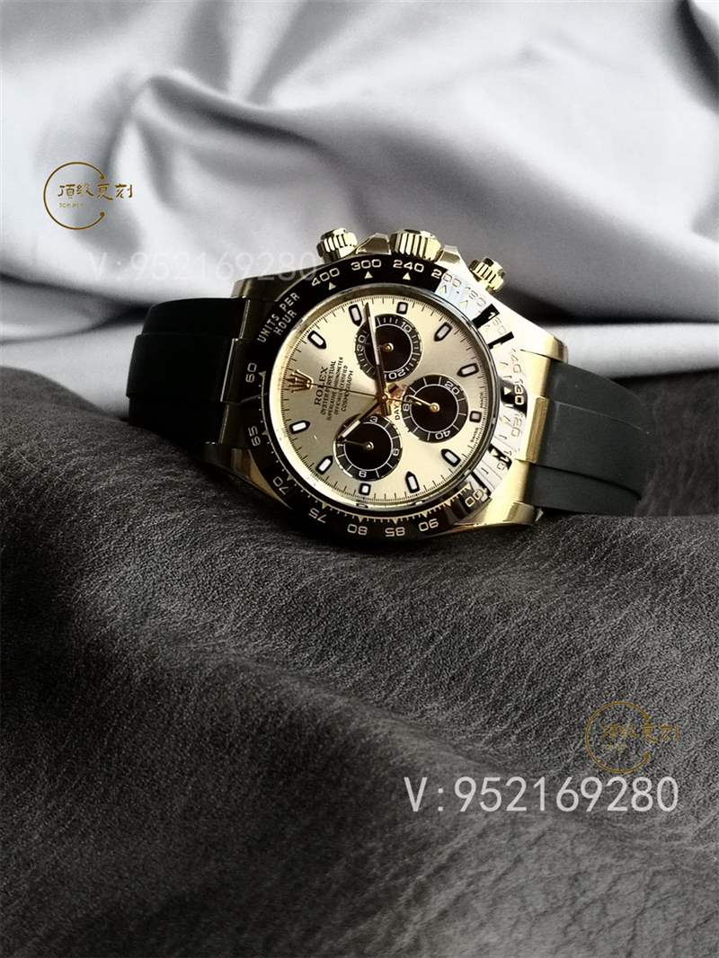 還有就是重量了,我們都是到貴金屬都是比鋼要重的,畢竟密度大,而正品是實金,采用的是18K金材質,勞力士擁有專屬鑄造所,澆鑄出高品質的18K金合金。透過混入不同份量的銀、銅、鉑金或鈀,可提煉出不同種類的18K金:黃金、粉紅金或白色黃金。所有原料均以高純度的金屬煉成,所以純金的分量還是很重。復刻采用的是精鋼打造,然后在離子電鍍黃金色,看上去顏色是一樣了,不過放在手上掂量分量肯定是有明顯的區別。C廠余文樂的重量在145g左右。