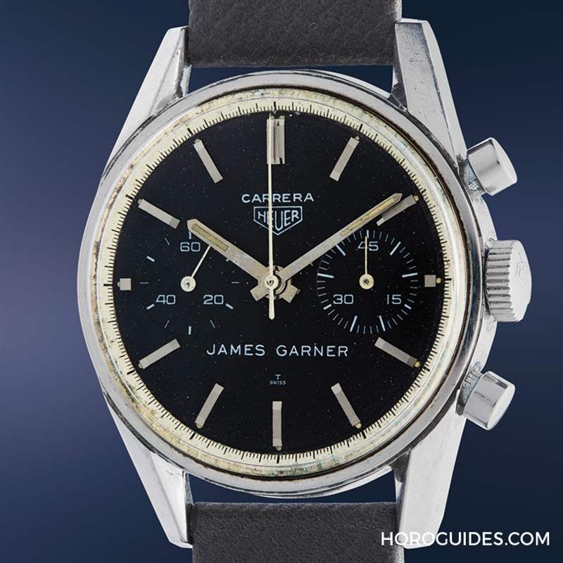 編號24拍品是美國影星James Garner的時計珍--一只約1966年制的Tag Heuer Carrera腕表型號2447,這只表徑35mm、精鋼材質的計時碼表,被命名為「Carrera James Garner」,表盤上除了有標示有品牌識別Heuer Carrera,六點鐘位置亦注記有「James Garner」字樣。曾入圍奧斯卡金像獎的的James Garner不只演過賽車手,現實生活中他本人也真的熱愛賽車,他的女兒Gigi Garner回憶說,他經常戴著這只表去駕駛賽車,這是「他最喜愛的日常配戴表」。此拍品由Tag Heuer博物館以17.6萬美元拍得。