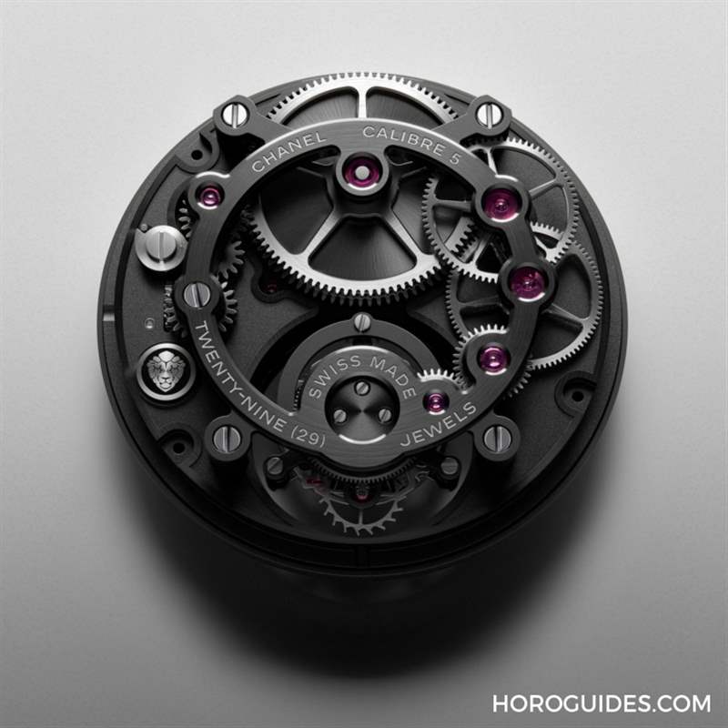 2016年CHANEL香奈兒推出了品牌首款自制機芯Caliber 1,機芯不但選擇了特殊優雅的瞬跳小時、逆跳分鐘顯示,橋板底下的齒輪等重要活動零件更是由獨立制表師Romain Gauthier所提供,整顆機芯都呈現出頂級專業制表的氣質。往后數年品牌接連推出了版路由多層圓環鏤空堆疊而成的Caliber 2、同樣緊扣著圓形與透視等元素的Caliber 3以及3.1、乃至于今年終于在自制型號中加入高階復雜功能的飛行陀飛輪Caliber 5,在短短六年間建構起了連專業制表品牌都為之汗顏的華麗陣容,展現出強大的實力以及旺盛的企圖心。