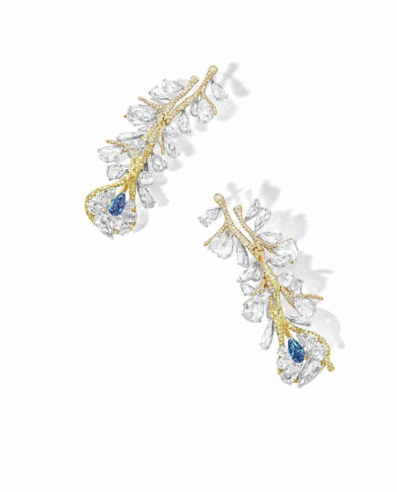 鑲嵌2顆水滴形切割藍鉆,分別為0.70ct和0.86ct,均達到 Fancy Intense Blue 色級,搭配水滴形切割鉆石,點綴圓形切割黃鉆和無色鉆石。