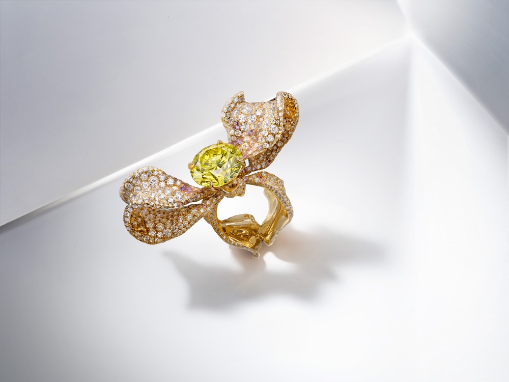 「四季系列」作品中,藝術(shù)家花費巨大時間精力確保每顆主鉆呈現(xiàn)最理想的火彩和光影。例如一枚樹枝造型戒指鑲嵌一顆20.31ct Zimmi 色黃鉆主石,運用彩鉆中較少見但對顏色和精度要求極高的祖母綠型切割,展現(xiàn)黃鉆通透的凈度和飽和色彩;一顆1.55ct心形切割艷彩粉鉆則演繹盛放的玫瑰花芯,成為奪目動人的焦點。