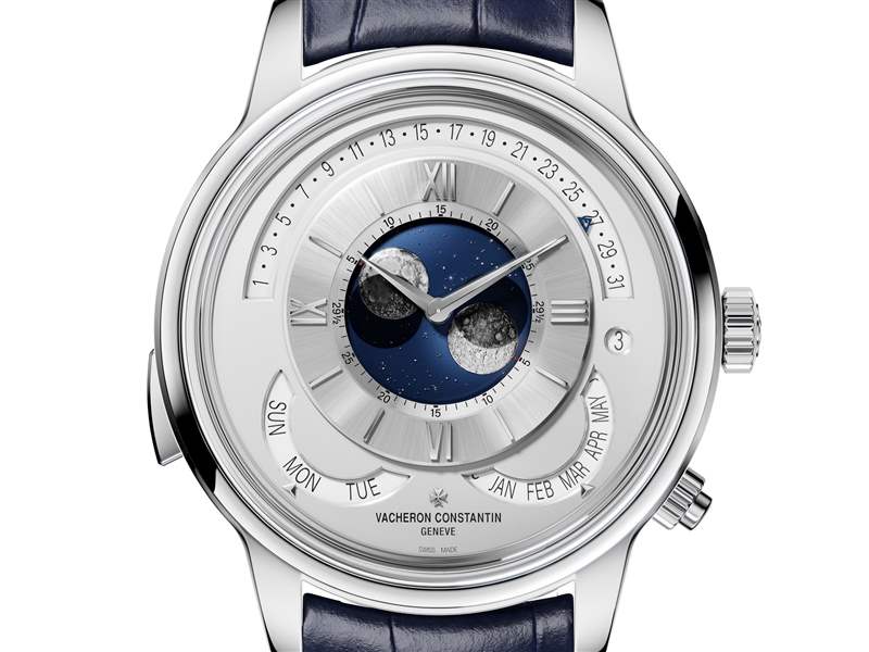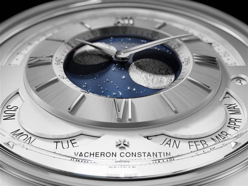 46mm白金表殼經(jīng)過鏡面拋光處理,側(cè)面設(shè)有調(diào)校按鈕與三問報(bào)時(shí)開關(guān)。表盤采用罕見的中央雙月相顯示,同時(shí)呈現(xiàn)南北半球的月相,月齡刻度位于時(shí)標(biāo)圈內(nèi)側(cè)。兩枚鍍銠「月球」運(yùn)用特殊工藝塑造月面「環(huán)形山」,背景由 PVD 工藝渲染出深邃的夜空。