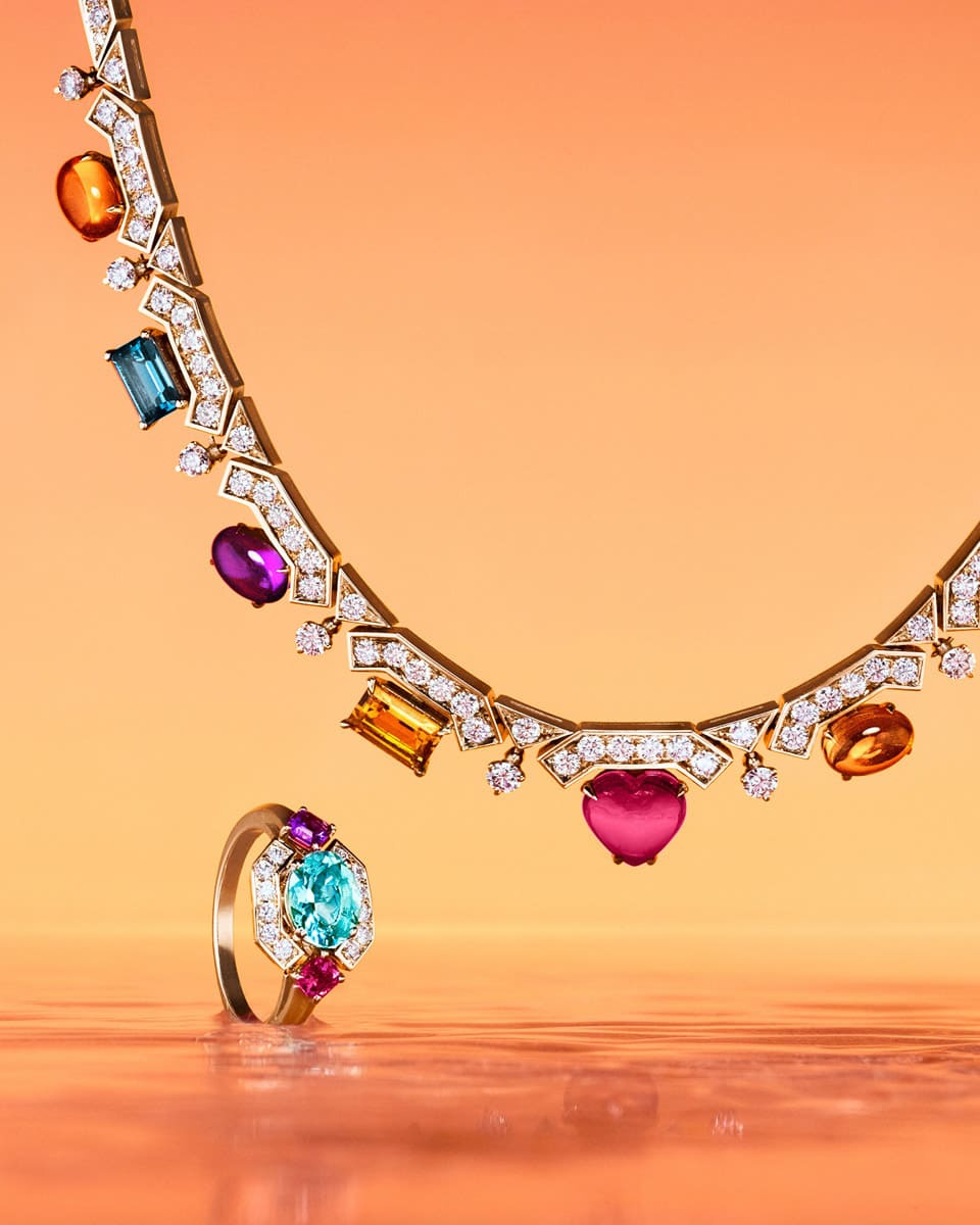Allegra系列有一款項鏈鑲嵌紫水晶、黃水晶、橄欖石與藍色拓帕石,在玫瑰金幾何元素環繞之中,明亮切割鉆石端坐于所有角落,18顆彩色寶石得以歡欣的姿態與微妙的美感,呈現充滿興味的作品。