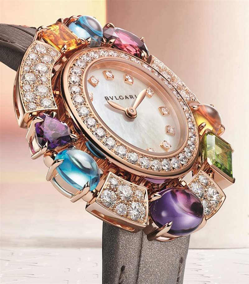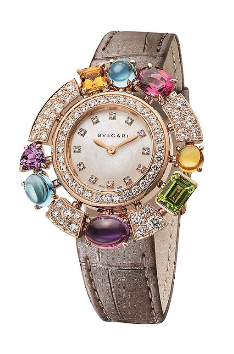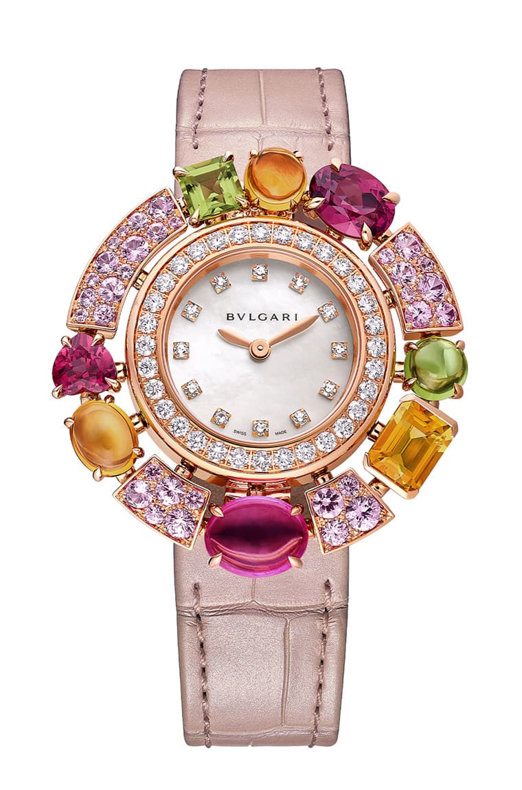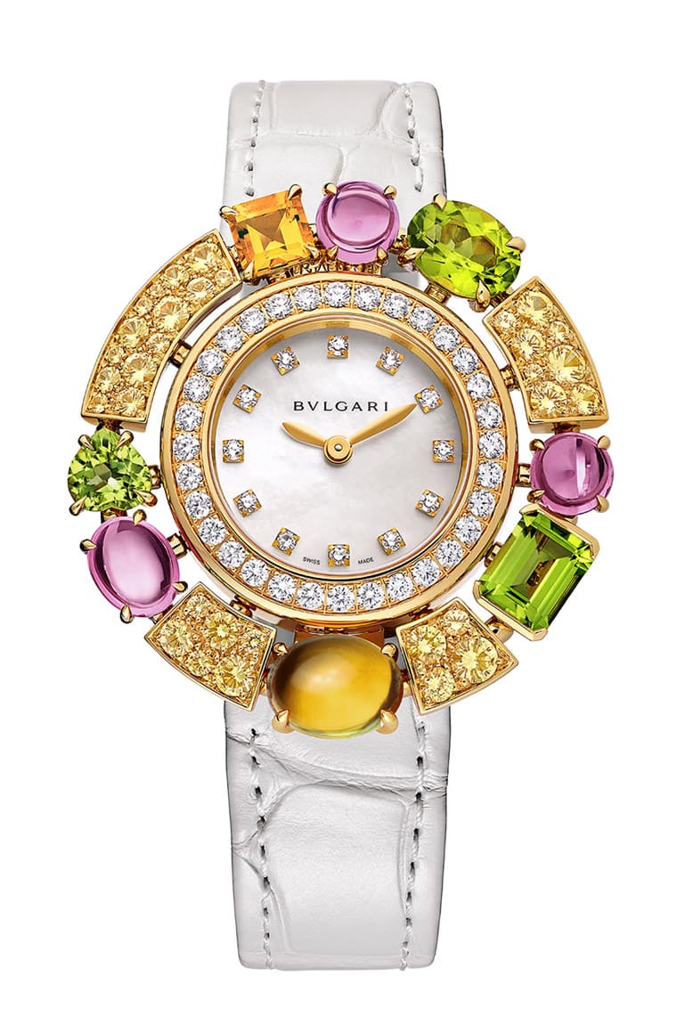 Allegra系列不只有珠寶作品,寶格麗亦將「時間即珠寶」的理念帶入生活,打造最新的雞尾酒珠寶腕表。腕表將碧璽、黃水晶、玫瑰榴石和橄欖石,以各種充滿歡樂的造型呈現,并搭配粉色或黃色剛玉點綴,持續以率性歡快的質感吸引女性目光,宛如手腕上綻放的嬌艷花朵垂涎欲滴,讓人一見傾心。