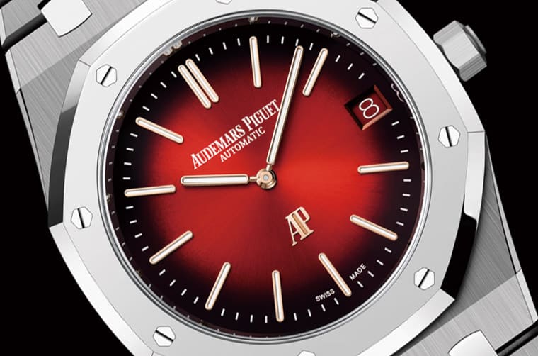 ▲16202XT的表殼、鏈帶零件為鈦金屬制成、表圈與錬節(jié)連接零件則是用BMG材質(zhì)打造,后者采用拋光處理為皇家橡樹Jumbo超薄表少見設(shè)計(jì),包括漸層紅色面盤也是系列中少見的嘗試。