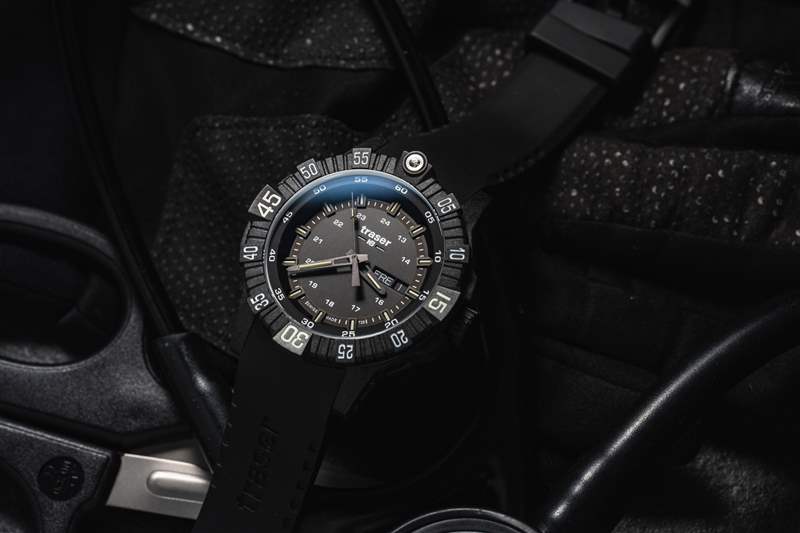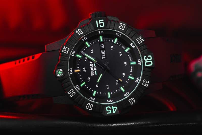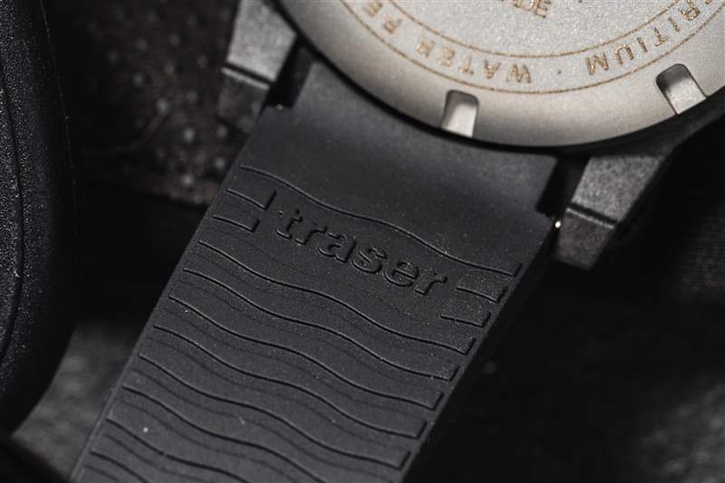 Traser P99 Q Tactical 是一款不小的手表,但戴在我 6.5 英寸的手腕上并不笨重(如上圖所示)。盡管尺寸較大,但混合表殼結(jié)構(gòu)和黑色碳纖維強(qiáng)化外殼的纖薄特性使其佩戴起來(lái)異常舒適。搭配的橡膠表帶重 100 克,也使其成為其他類似尺寸手表的輕巧替代品。這種較大的尺寸還可以防止它滑到襯衫或夾克的袖口下面,與大多數(shù)手表相反,這在緊急醫(yī)療領(lǐng)域是首選。在大多數(shù)情況下,戴著臟手套將袖帶向后滑動(dòng)來(lái)檢查時(shí)間并不理想。然而,帶有棱紋的表圈很容易被任何類型或任何污垢量的手套抓住。雙向 60 次點(diǎn)擊邊框是一個(gè)令人愉悅的功能補(bǔ)充。雖然傳統(tǒng)的潛水表圈是單向的,但現(xiàn)場(chǎng)使用設(shè)備的多功能性和適應(yīng)性受到贊賞。如果我要改變邊框的一件事,那就是可以選擇更換其他刻度以滿足任務(wù)要求。