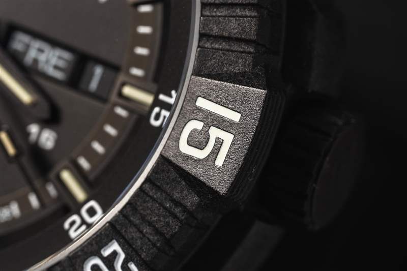 在腕表的尺寸、重量和耐用性之間尋找平衡幾乎總是取決于材料。通常,鈦是首選金屬,但它并不是唯一的功能性金屬。Traser 在 P99Q Tactical 上選擇了混合外殼結(jié)構(gòu),以彌補(bǔ)尺寸和重量之間的差距。表殼的外殼由碳纖維增強(qiáng)聚合物制成。中殼和表耳的部分經(jīng)過(guò)鏤空處理,與碳纖維增強(qiáng)材料的細(xì)粒效果相結(jié)合,賦予外觀動(dòng)感的外觀。表殼內(nèi)部是一個(gè)鋼質(zhì)容器,里面裝有機(jī)芯和表盤(pán)。兩部分結(jié)構(gòu)形成一個(gè)大型整體封裝,直徑為 46 毫米,凸耳到凸耳之間為 53 毫米,厚度為 13.7 毫米。配備 8 毫米旋入式表冠、實(shí)心精鋼底蓋和藍(lán)寶石水晶玻璃,