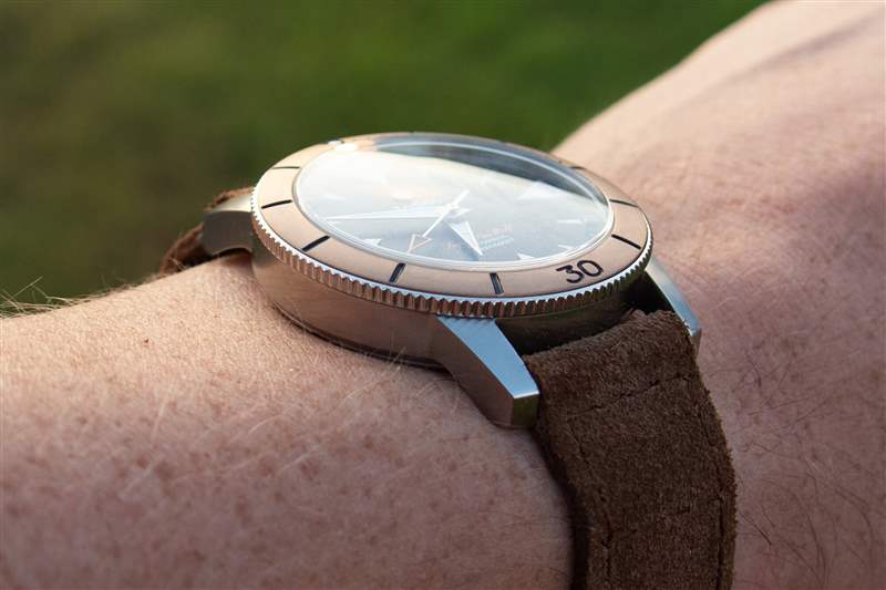 當然,我從來沒有擔心過手表在海洋或我們租的房子的游泳池中的安全性(盡管你不會想知道,我五歲的孩子更喜歡游泳池,而他更年輕但更大膽的弟弟很快就熱情起來了)并首選海洋)。該腕表配備與表圈相匹配的青銅旋入式表冠,帶有 Zodiac 標志,以及纖薄但易于抓握的脊狀部分,有助于提供 200m 的防水性能。此外,雖然我沒有用麂皮表帶冒險進水,但將橡膠表帶牢固地固定到位的扭結帶扣讓我感到很安慰。