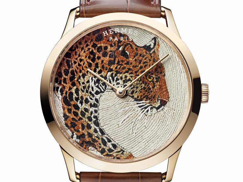 「Slim d’Hermès Panthère」腕表的設計靈感來自 Hermès 同名絲巾,采用皮革馬賽克鑲嵌工藝(Leather Marquetry)創造一只靈動的「印度花豹」。這只花豹由數千枚微小的皮革碎片組成,所有碎片都由工匠手工剪裁和拼貼,再現花豹皮毛的柔軟觸感,不規則的黑色斑點尤為突出。每一枚表盤制作耗時超過一周。