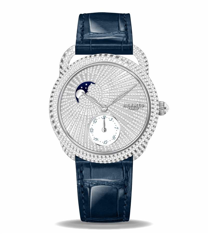 珠寶腕表中最引人注意的是一枚「Arceau Petite Lune」小月相腕表——以10點的月相盤為中心,通過1084顆明亮式切割鉆石在表盤、表殼及表耳上勾勒出放射狀線條,在白金盤面的襯托下熠熠生輝,如同皎潔的月光鋪灑大地,風格浪漫而充滿詩意。