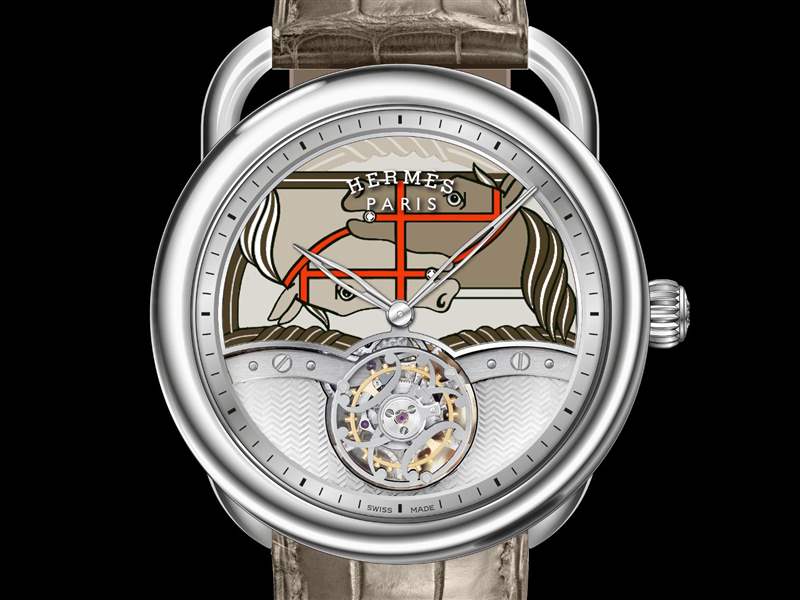 Arceau 系列本次推出一款復雜功能作品——「Arceau Quadrige」飛行陀飛輪腕表,表盤以掐絲琺瑯工藝塑造出抽象風格的駿馬圖騰,每一枚表盤的琺瑯圖案均需經過多次燒制。飛行陀飛輪框架的「雙H」元素源自巴黎圣奧諾雷市郊路 Hermès 精品店的鐵藝裝飾,陀飛輪兩側裝飾幾何璣鏤紋理。
